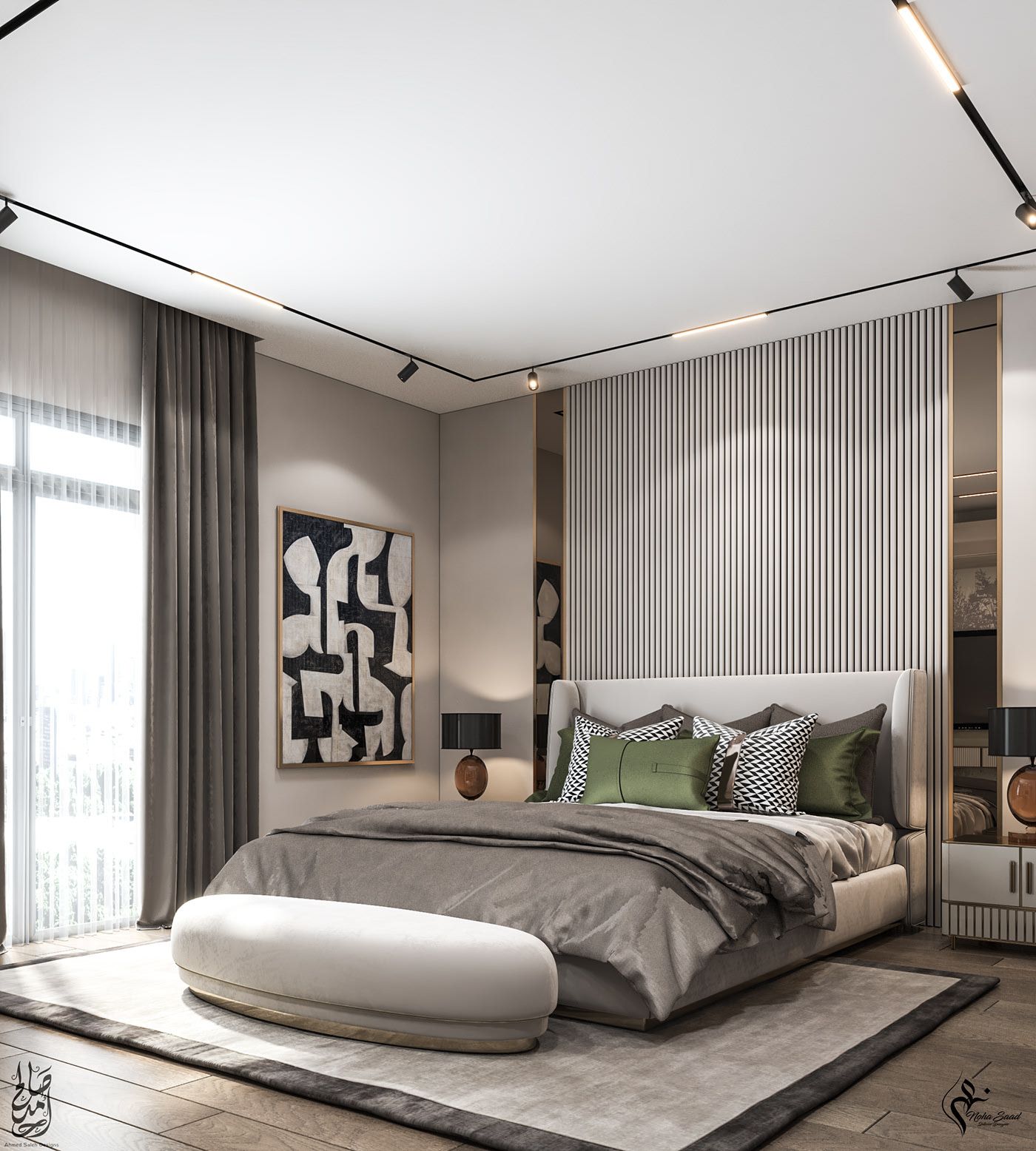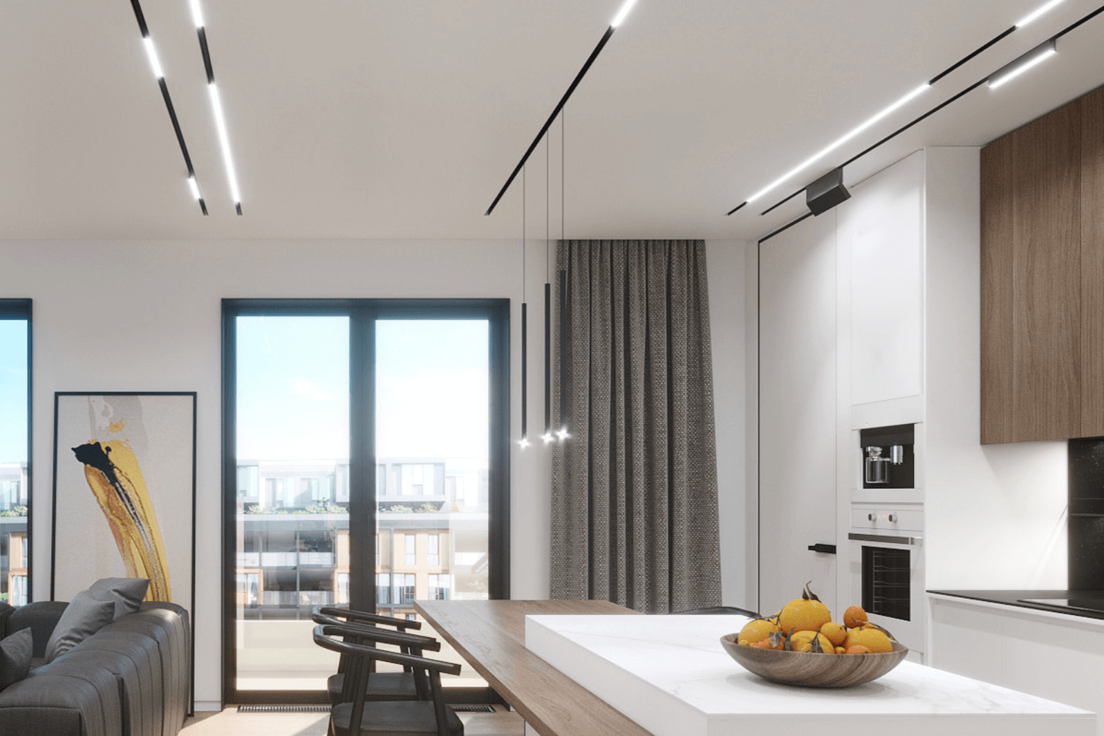 Вбудована конструкція дозволяє прибрати з очей всі елементи кріплення, «розвантажуючи» простір, і створюючи в інтер’єрі мінімалізм. Вигляд штор, які струмують вниз з натяжного полотна з нізвідки, погодьтеся, інтригує та вражає. Та й візуально вбудований в натяжну стелю карниз зі шторами оптично збільшує висоту кімнати, що є актуальним для невеликих приміщень.