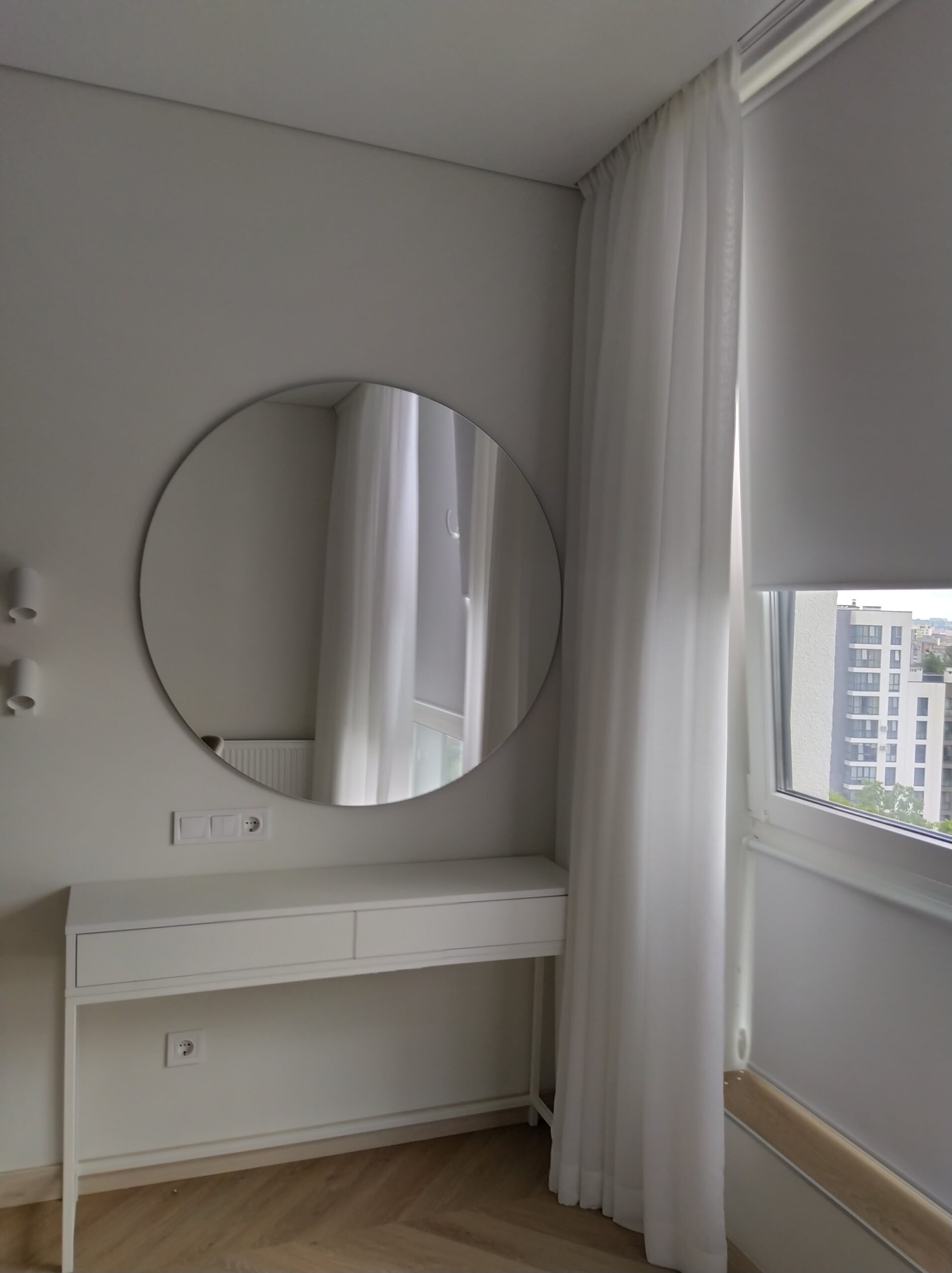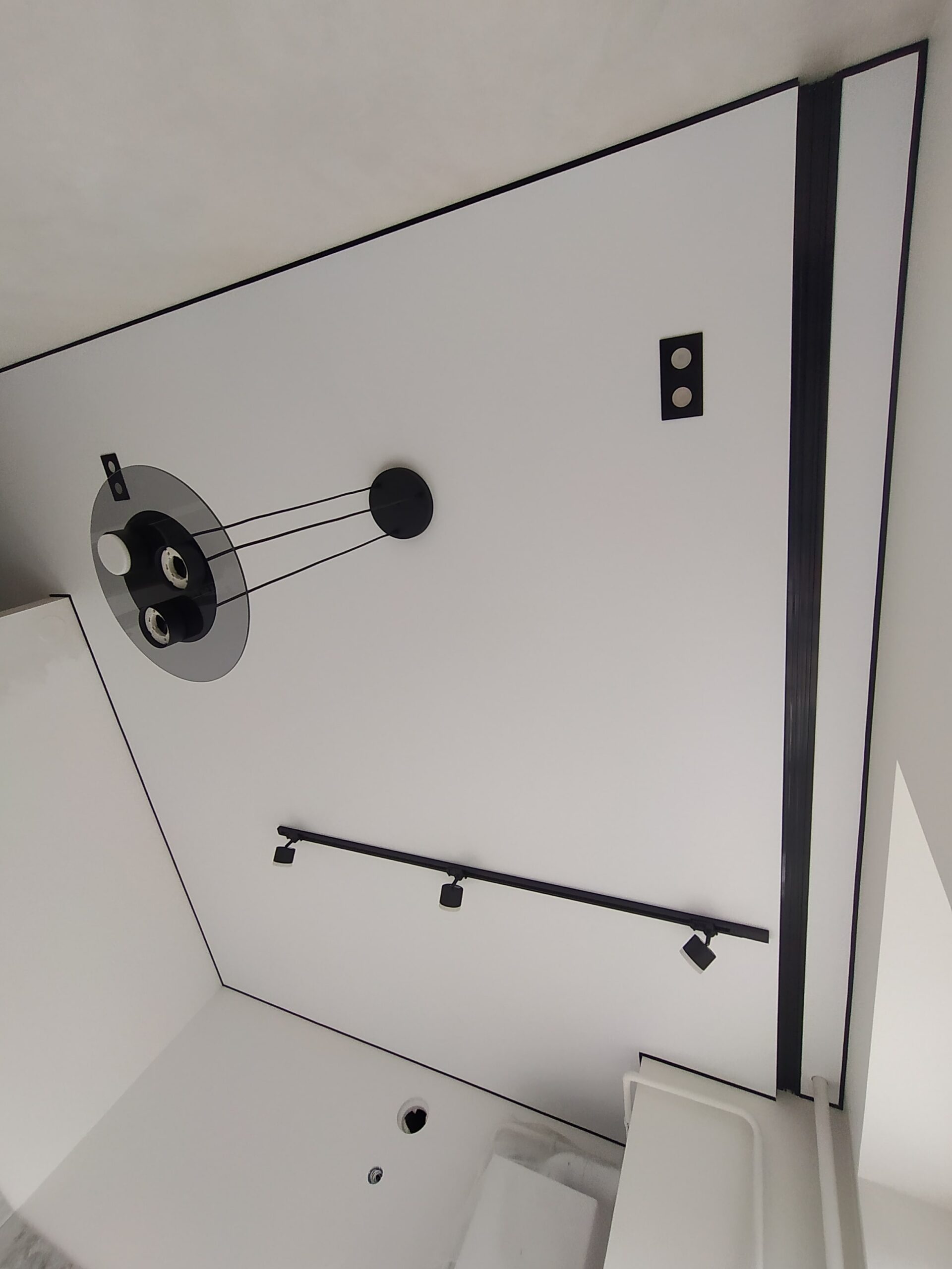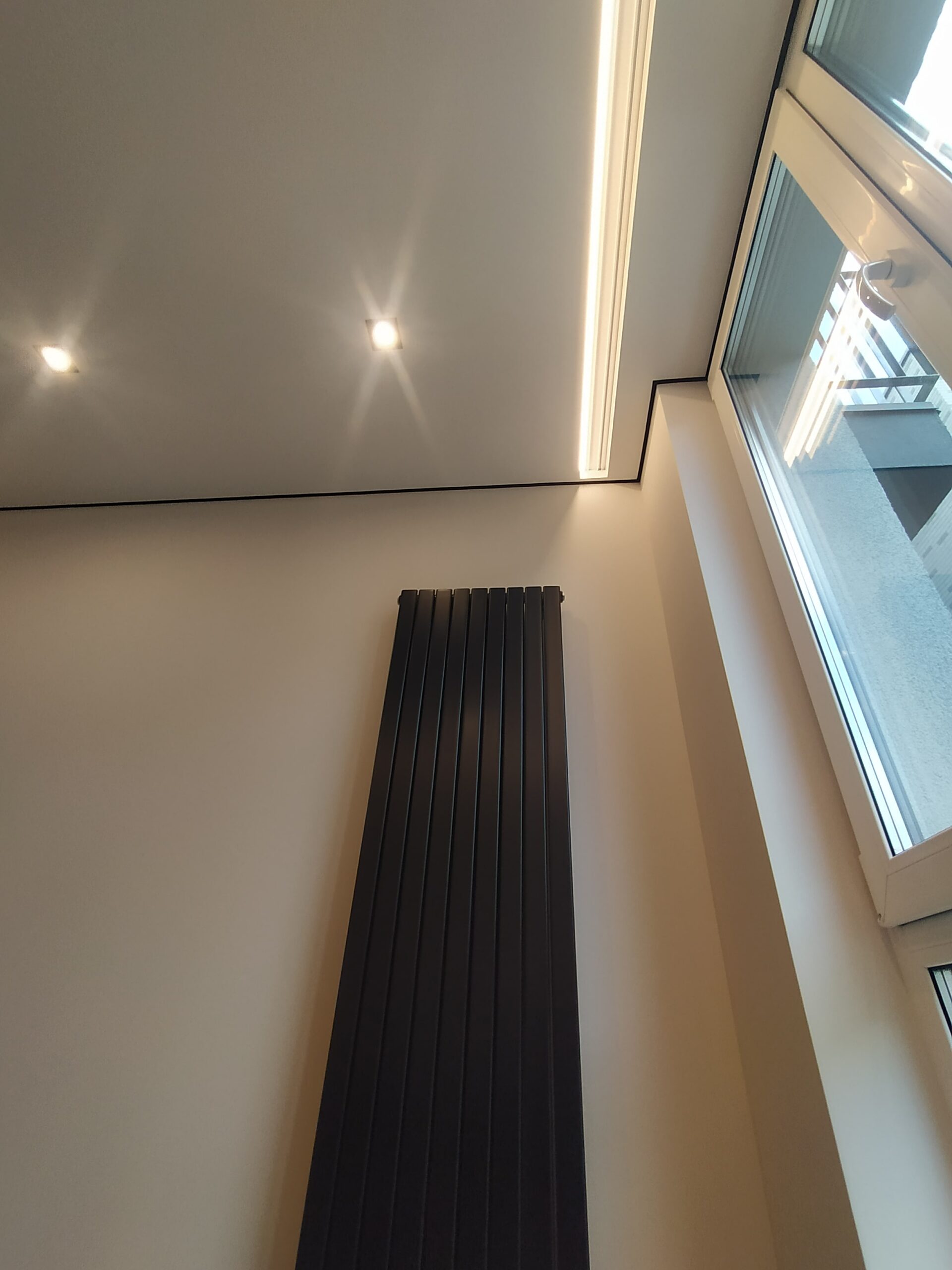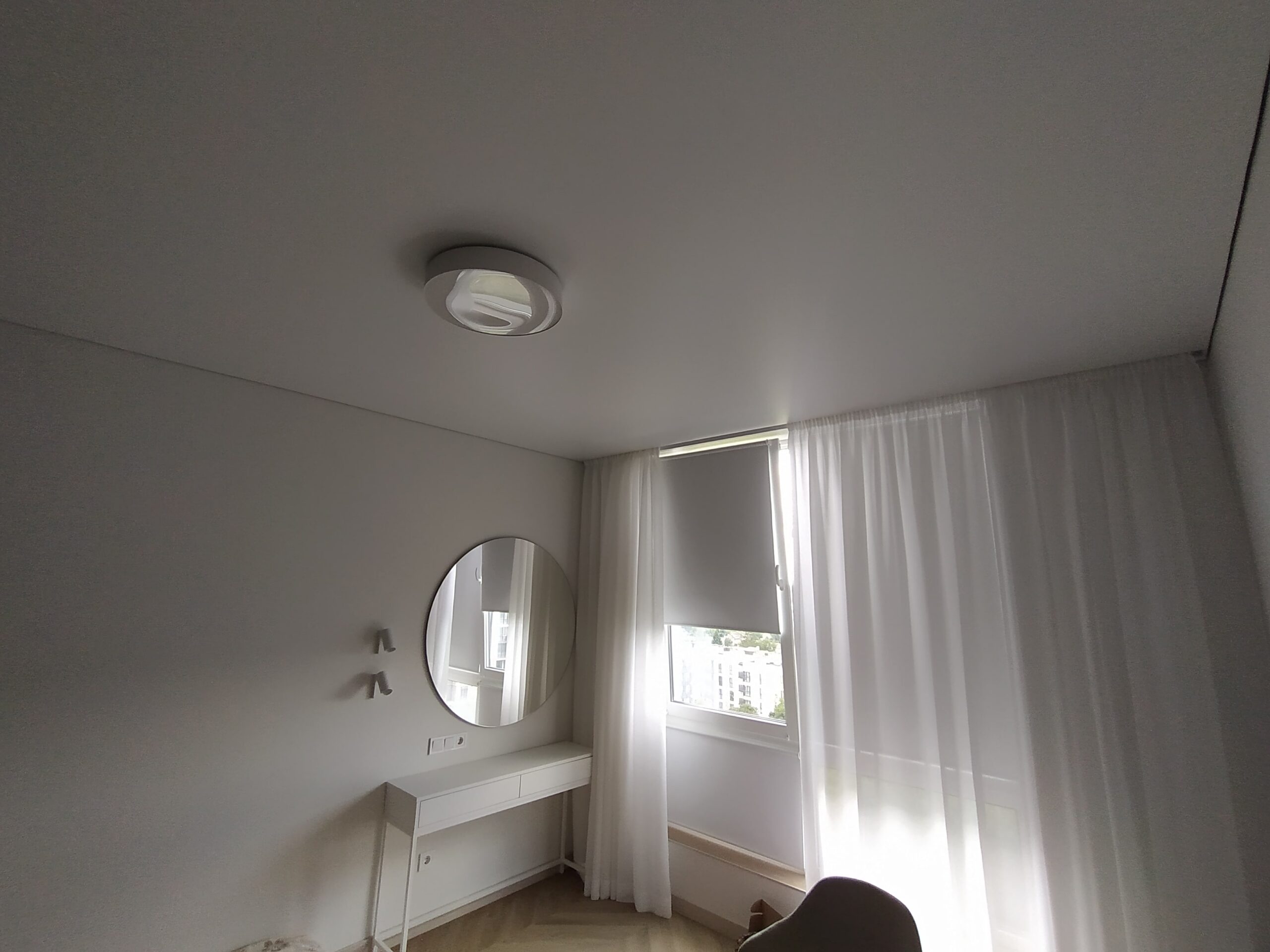 У випадку з гіпсокартоном прихована конструкція передбачає створення спеціальної ніші між стіною та натяжним полотном. Наперед потрібно передбачити деякі нюанси: правильно розрахувати розмір ніші для вільного руху штор, врахувати ширину батареї та підвіконня, якщо вони є під вікном. Заштукатурити та пофарбувати чорнове покриття. Тепер все це у минулому!