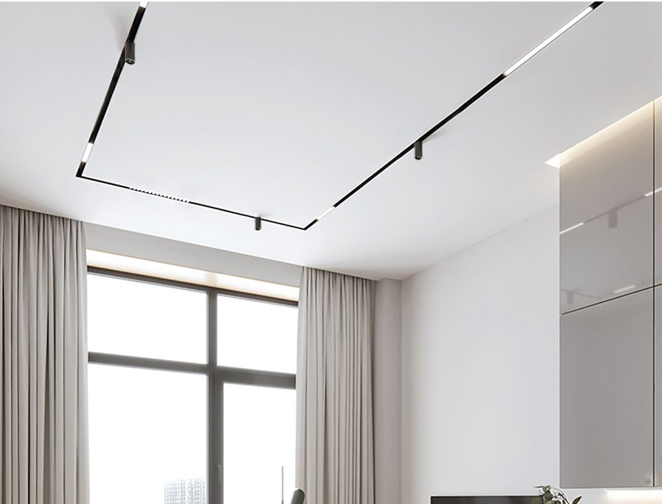 Світильники у шинопроводі утримуються за допомогою замка. Ми можемо вбудувати їх у площину натяжної стелі за допомогою сучасних профільних систем.